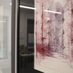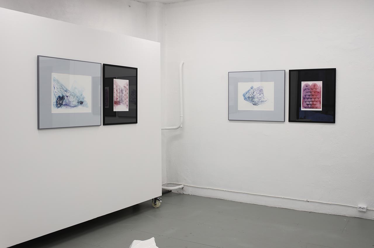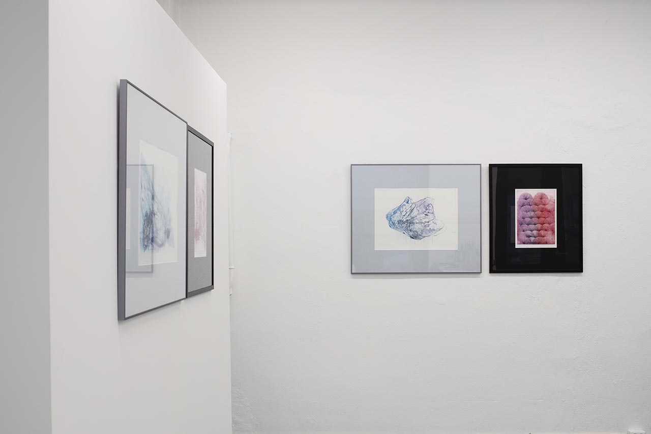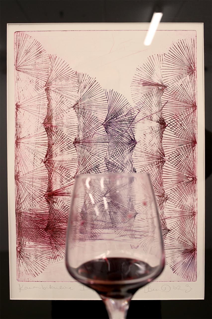 Inspired by Kaplinski’s literary reflections on the kinship between species, distant journeys in mountain landscapes and the local bogland, the graphic works are composed together as a recurring word pair: ice and heather. Blue lines scratched into the ice in drypoint technique create a new combination with geometric reddish etchings reminiscent of bog plants. Ice and Heather is a printmaking exhibition that seeks commonalities between writing and drawing, creation and the forces of nature.