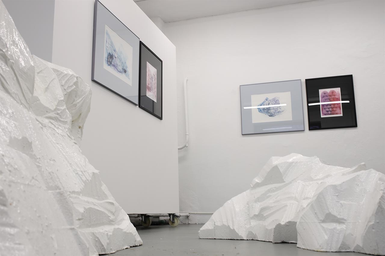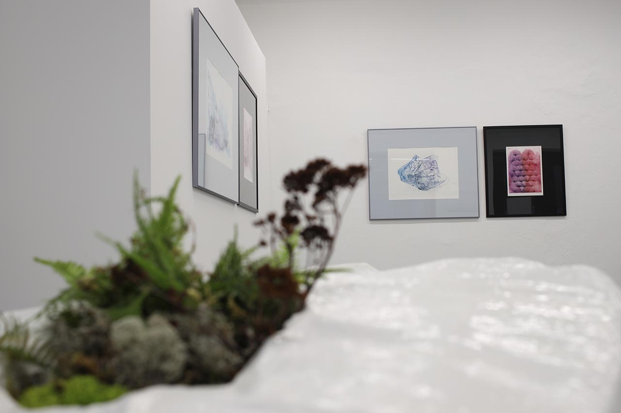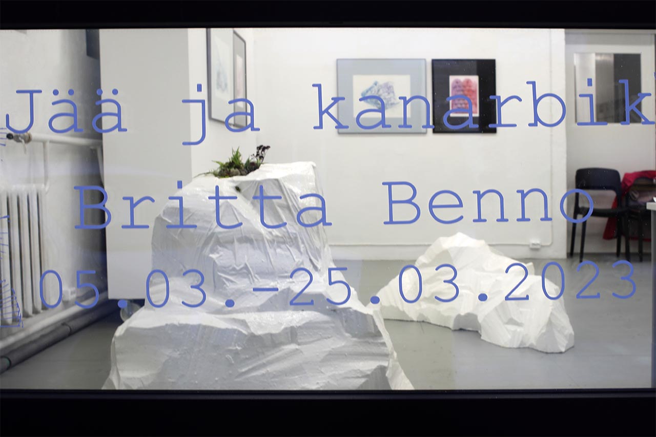 Britta Benno eksponeerib GÜ galeriis sügavtrükitehnikates graafikateoseid: kuivnõela neljaosaline seeria “Polaarulm” moodustab sõnapaari ofortidega “Kanarbik I-IV”. Kaplinski kirjanduslikest mõtisklustest liikide vahelisest hingesugulusest, kaugetest rännakutest mägimaastikel ja kohalikust rabamaast inspireeritud graafilised teosed on kokku komponeeritud kui korduv sõnapaar: jää ja kanarbik. Kuivnõela tehnikas sinised jäässe kraabitud joonestikud loovad uue koosluse rabataimi meenutavate geomeetriliste punakate ofortidega. Jää ja kanarbik on trükigraafikanäitus, mis otsib ühiseid jooni kirjutamise ja joonistamise, loomise ja loodusjõudude vahel.