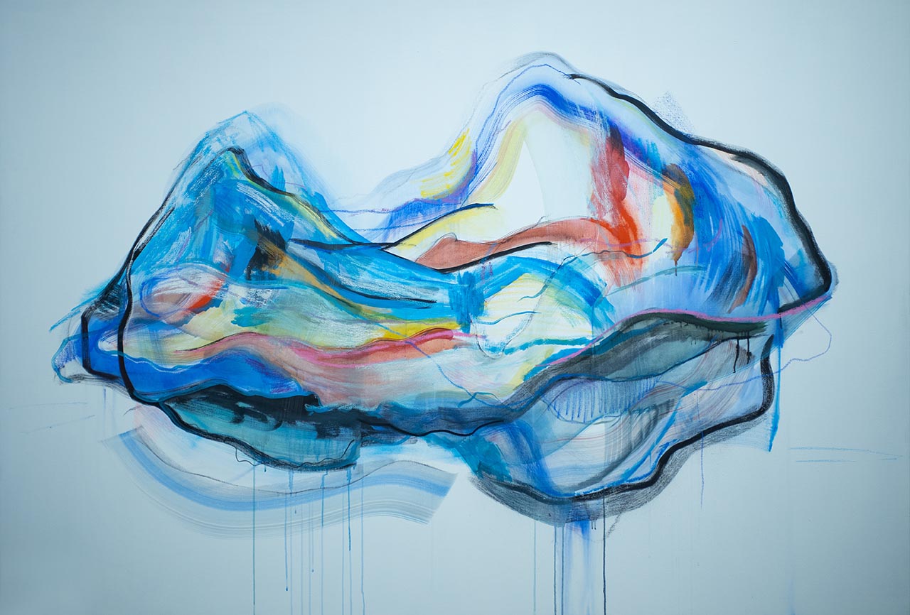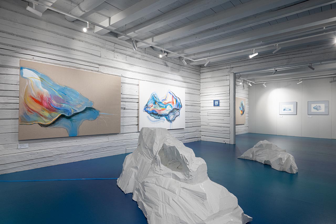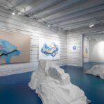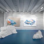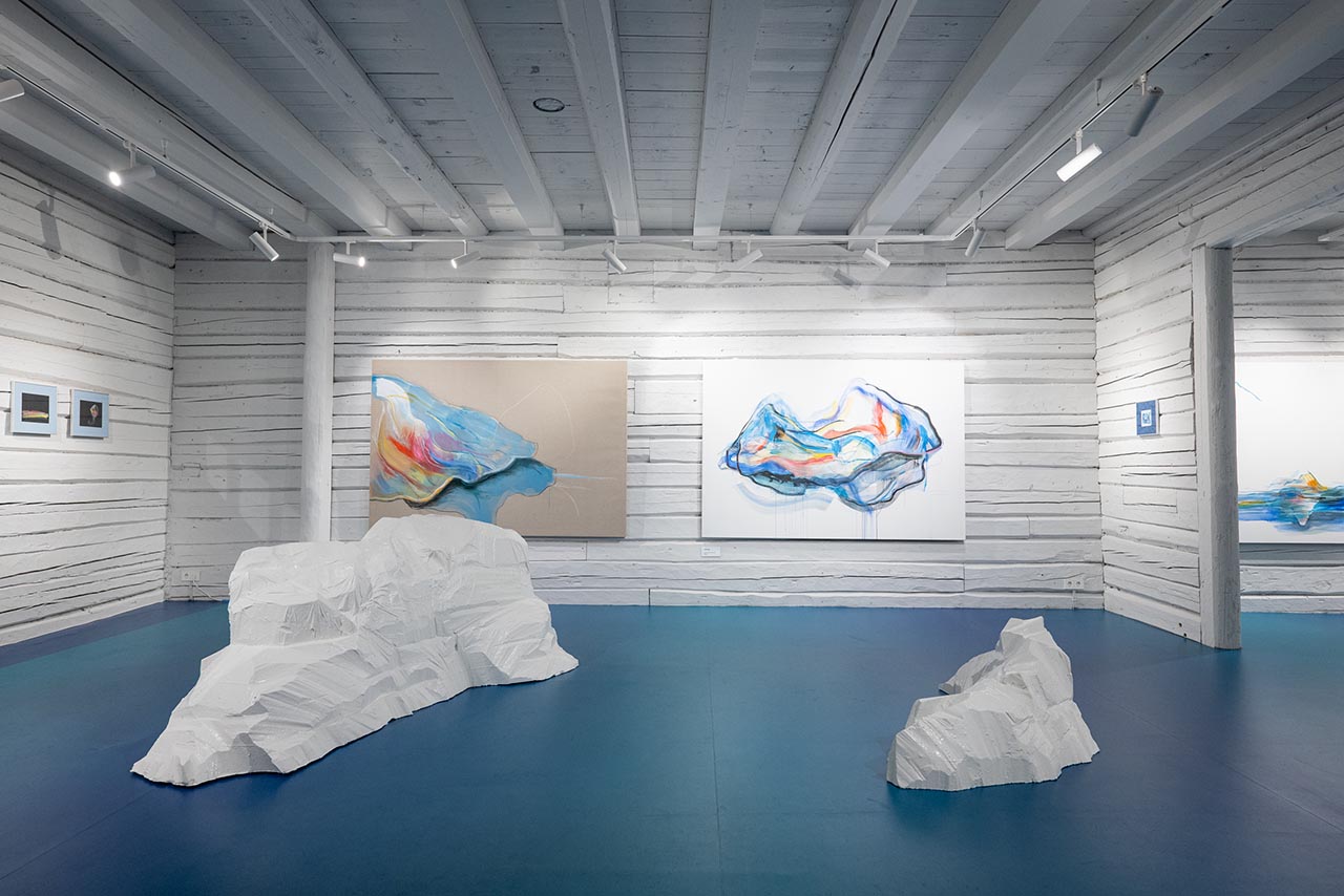 A fantastical landscape abstraction unfolds on the gallery’s white walls and polar blue floor.