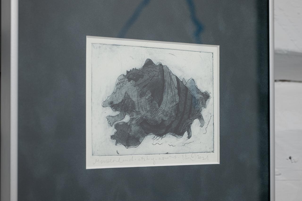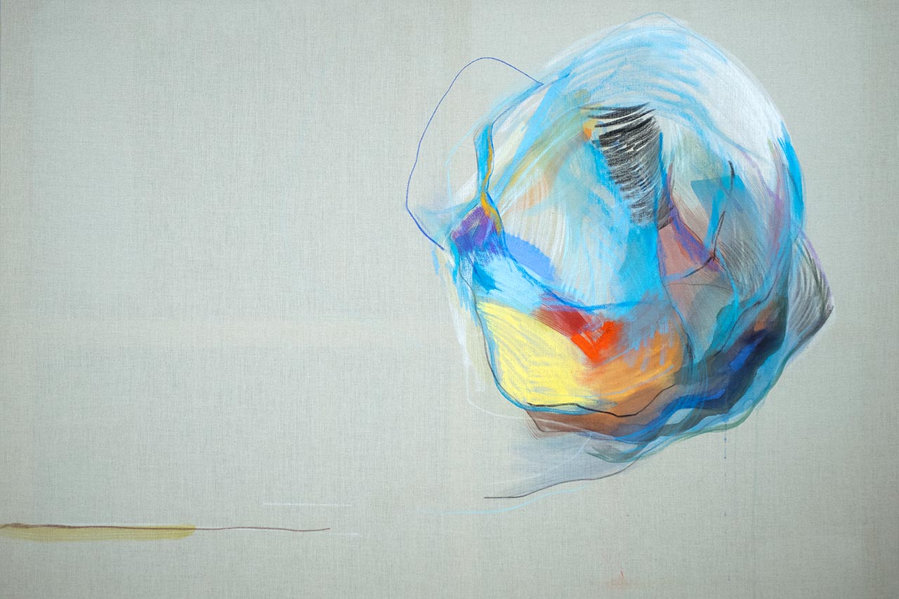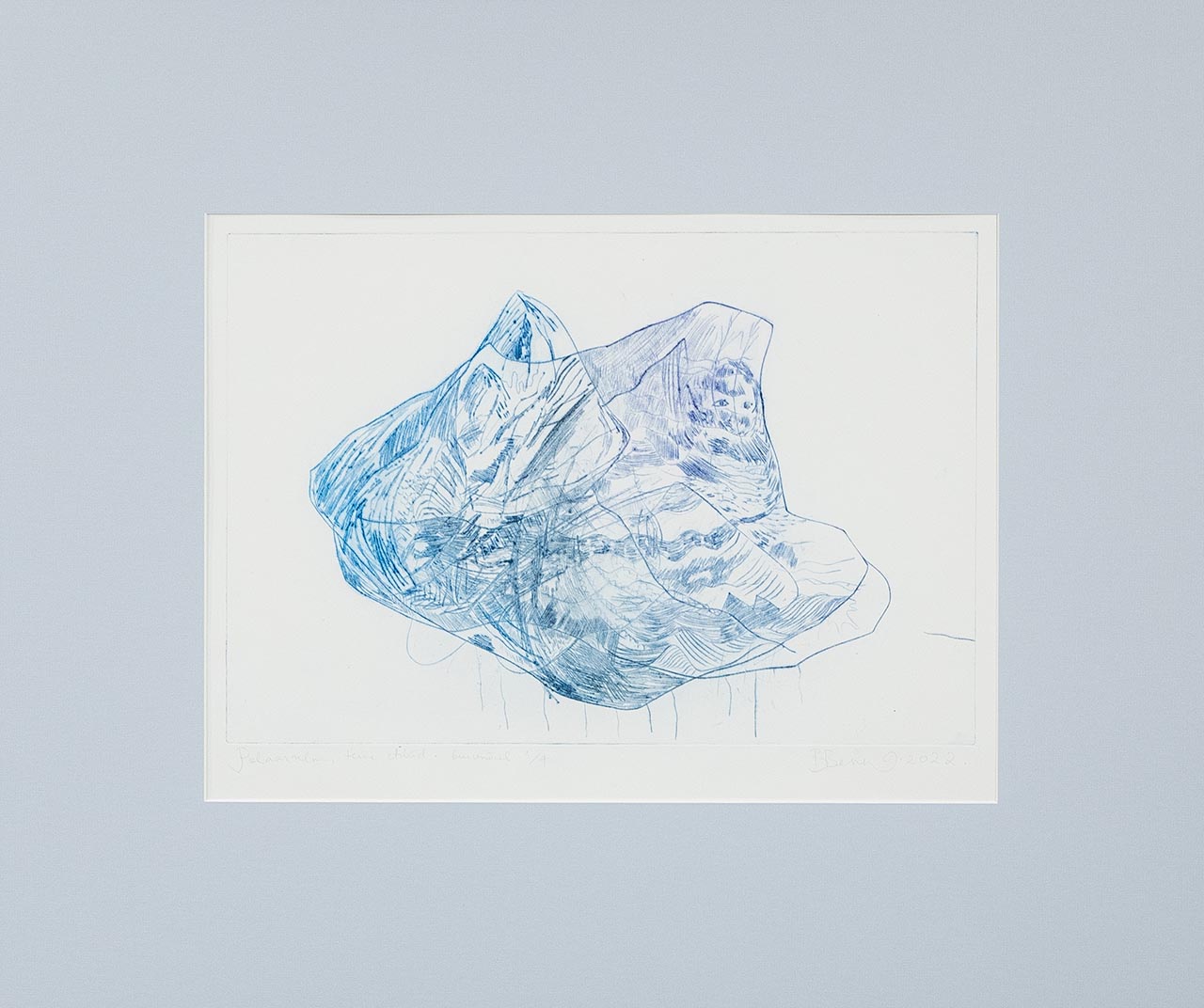 Drawings and graphics with a coolly glowing color palette wander in the plastic forms of ice, the openness of the image gives space for reflections and dreams. Mountains and landscapes are alive, mountains are the Inuit language. The North Pole belongs to dreams, creatures and minerals that vibrate in all layers of the earth. In the form of ice, our boulder-strewn land, the weight of the mountains is still perceptible when traveling on the ironed earth, promises are still in the air. Singingly flowing ice and Earth are uncertain forms of change that never remain still in their constant becoming. The landscape becomes an abstract image, becomes a breathing being.