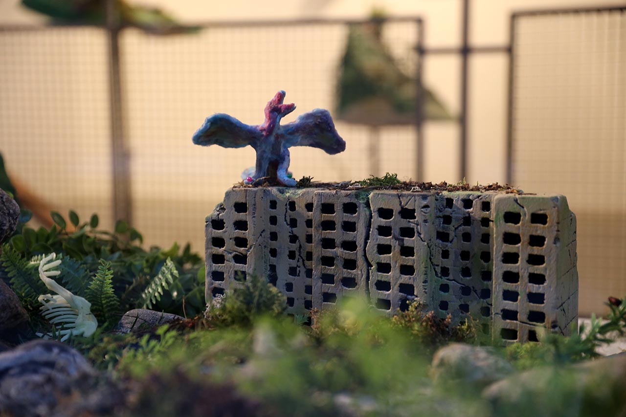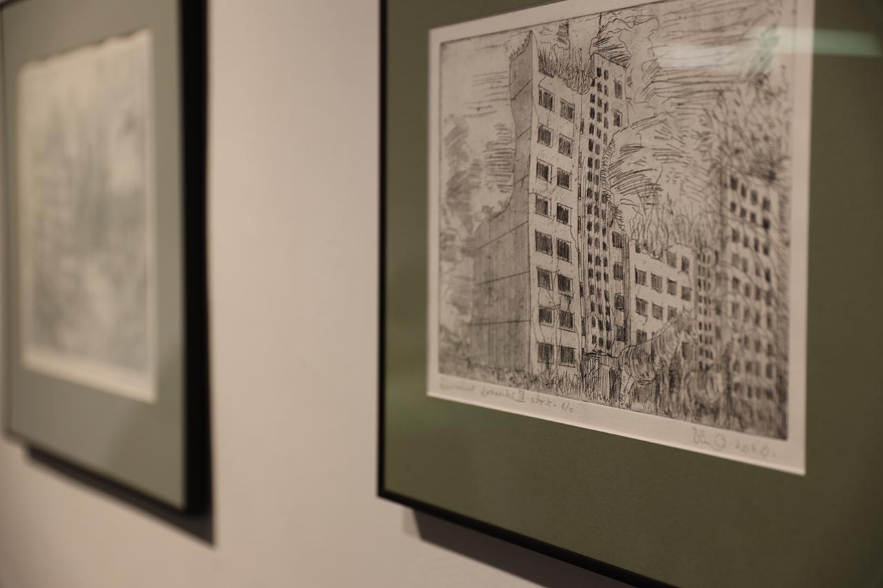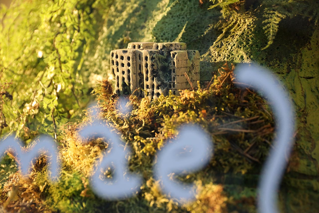 “Ruinenlust: Lasnamägi” is a science fictional prospective to post-human urban landscape where jungle and mountaneous terrain with the future creatures have taken over the ruins of a former bedroom community. Pleasure of looking at the ruins, Ruinenlust, is projected to the district of Lasnamäe that has lost the heavy burden of meanings. The message has been expressed through the models of houses characteristic to Lasnamäe have been used in puppet animation as well as the etching drawings that look like findings from an ancient civilisation.